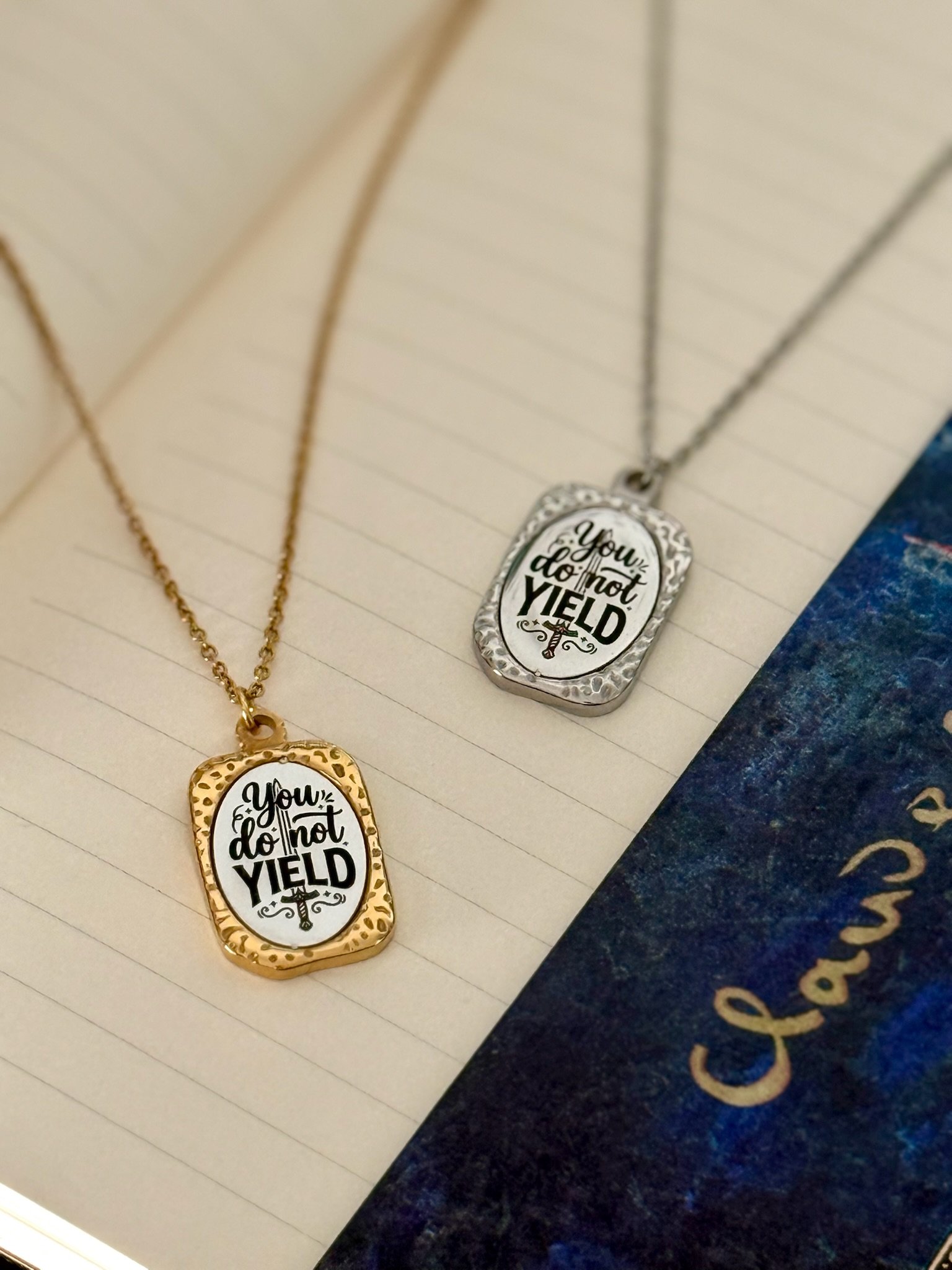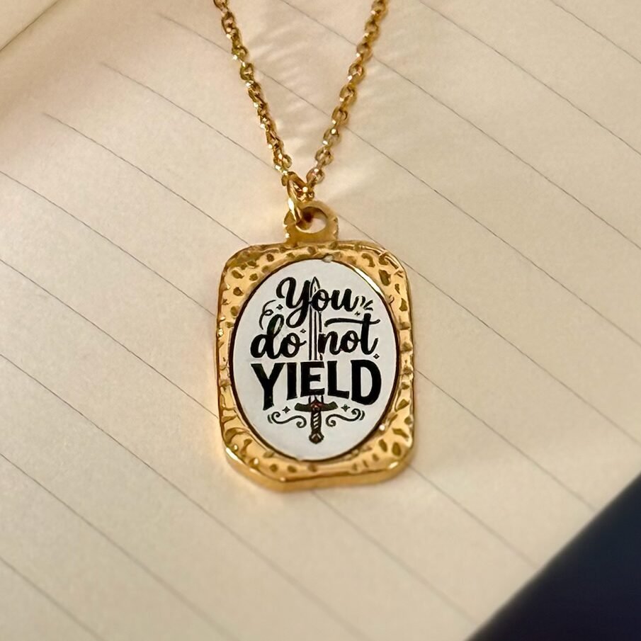 This necklace highlights one of the most powerful quotes from the Throne of glass saga: “You do not yield”. The text is engraved on a mirror-finish surface that reflects the light, adding elegance and timeless beauty. A strong and meaningful piece, perfect for fantasy lovers and for anyone wishing to carry a reminder of courage close to their heart.