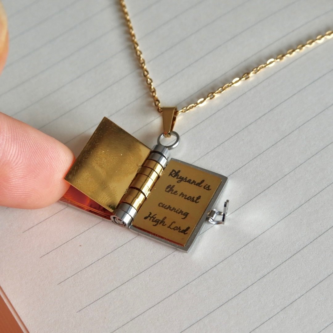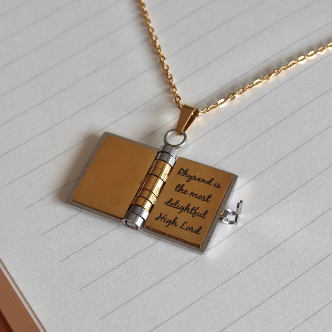 This book-shaped necklace is a tribute to the iconic scene where Rhysand teaches Feyre how to read by making her copy mischievous, arrogant phrases. The pendant opens to reveal 6 pages, with 3 engraved quotes: